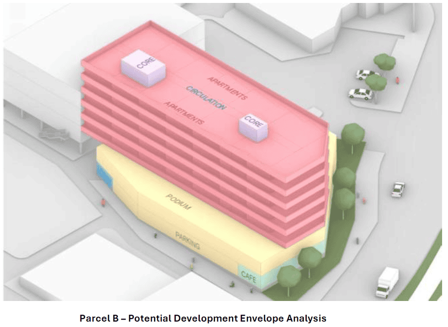 • Parcel B: 6,000–7,000 m² GFA (2-3 levels of public parking capacity with 4+ levels of residential accommodation above)